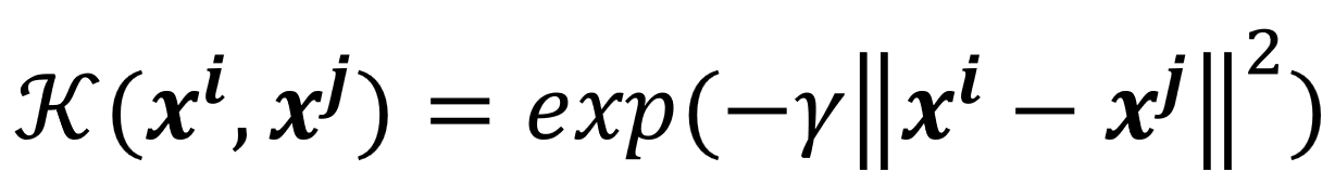 - Kernel 트릭은 기존의 특징 데이터를 SVM이 구분 가능한 데이터의 형태로 변환 시키는 것이다. 아래는 널리 사용되는 Kernel 중 하나 인 방사 기저 함수(Radial Basis functionl; RBF) 이다.