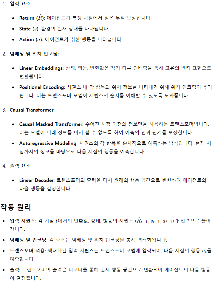 - 이 아키텍처는 RL 문제를 조건부 시퀀스 모델링으로 변환함.