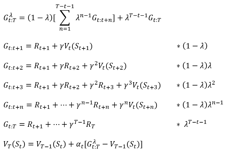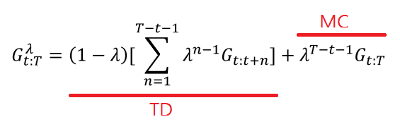 - λ 값을 0 보다 크고 1 보다 작은 사이의 값을 두면 MC 방법과 TD 방법을 동시에 가중치를 두고 쓰는 방법이다.