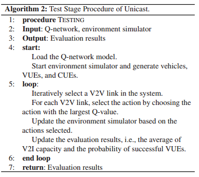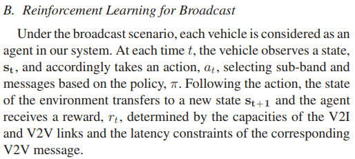 - V2V resource allocation 문제를 해결하기 위해 unicast, broadcast 시나리오 모두 state, action, reward를 설계함.