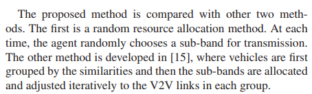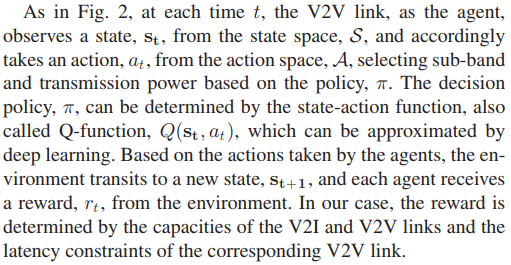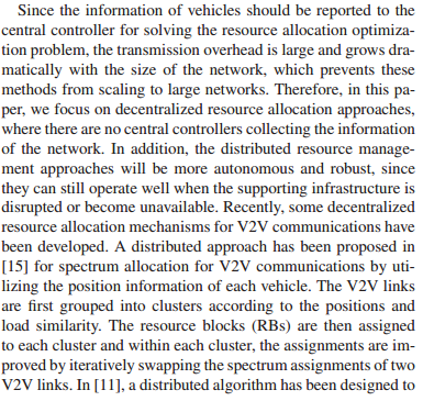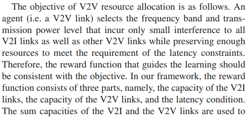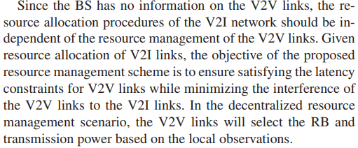 - V2V 링크의 대기 시간 제약을 해결하기 위해 Deep Reinforcement Learning을 기반으로 decentralized resource