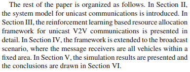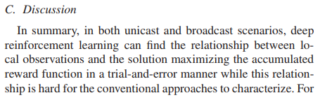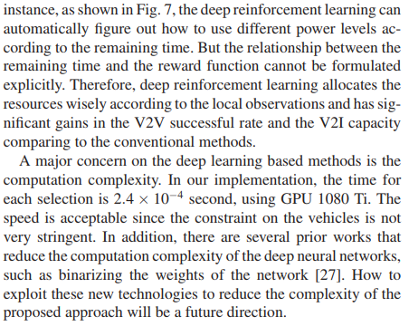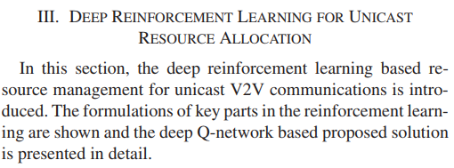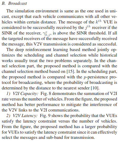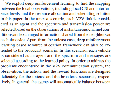 23. 본 논문은 unicast and the broadcasting 차량 통신에서 resource allocation을 처리 하기위해 Deep Reinforcement Learning을 사용함.