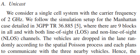 2. Unicast 실험에서는 Single cell system에서 함. Carrier frequency는 2GHz. 이고 simulation map은 Manhattan case임. 자세한건 3GPP TR 36.885에 있음.