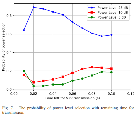 17. 흥미로운 것은 남은 시간이 적을 수록 가장 높은 전송 전력을 선택할 확률이 높았었다. 이는 latency 제약 시간 만기 까지 얼마 남지 않았을 때 V2V의 latency 제약 조건을 만족하기 위해 최대 전력을 선택한 것으로 보인다.