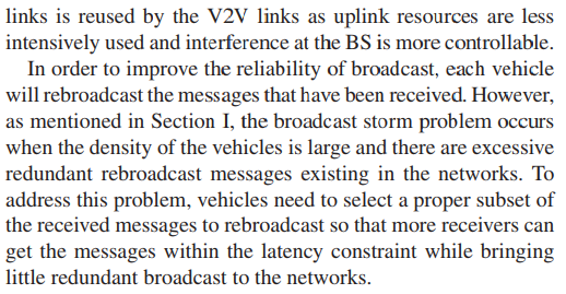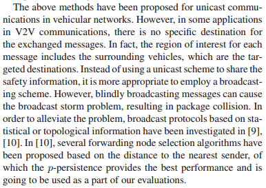 그러나 1장에서 언급한 바와 같이 boradcast storm 문제는 차량의 밀도가 크고 네트워크의 과도한 중복 재방송 메시지가 존재하는 경우를 발생 시킴.