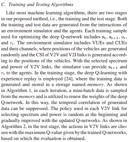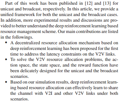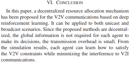 1. 심층 강화학습 기반 V2V communication에서 분산형 자원 할당 메커니즘을 제안함.