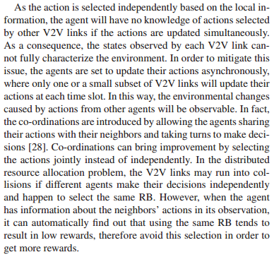 61. 이 문제를 해결하기 위해 강화학습 agent는 V2V link에 대해서 전체 집합이 있다면 하위 집합으로 쪼개어 각 time slot에서 쪼개어 비동기식으로 작업을 업데이트 하도록 설정함. (즉 모든 V2V link의 강화학습 agent가 동시에 선택하는 것이 아니라 하위 집단으로 쪼개어 순서대로 선택한다는 뜻임.)
