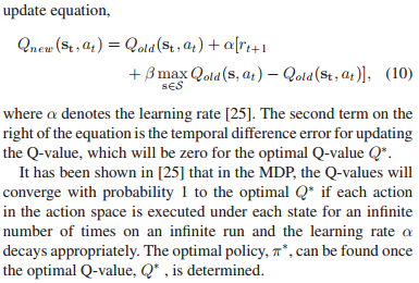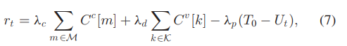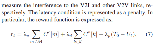 latency 제약 조건 위반시 -reward, latency 제약 조건 충족시 +reward, V2I link의 data rate가 높을 경우 + reward