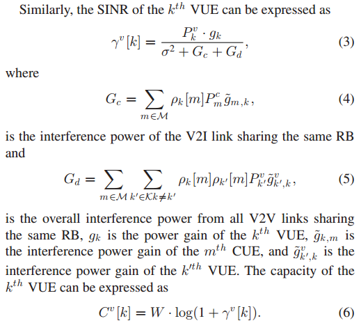 아래 노테이션은 k 번째 VUE 가 V2V link를 통해서 전송할때 생기는 Channel gain임.(송신 차량 안테나 게인, 수신 차량 안테나 게인, Large scale fading, Small scale fading 등이 적용).