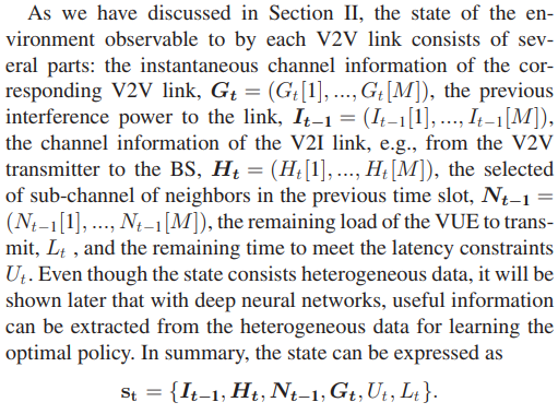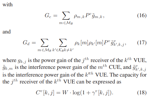 17. 아래 노테이션은 t time slot에서 관측한 V2I link가 RB에서 관측한 channel information임. 즉 V2I link에서 차량과 기지국(BS)간에 형성된 채널 정보임. (power gain 이라고 함)