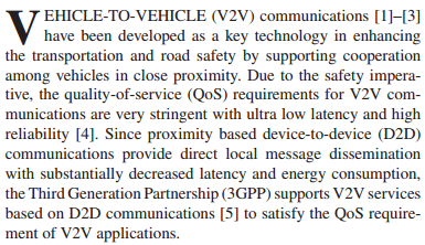 2. 근접 한 장치 기반 D2D 통신은 대기 시간과 에너지 소비를 크게 줄이면서 직접 로컬 메시지 전파를 제공하므로 3GPP는 V2V 통신의 QoS 요구 사항을 충족하기 위해 D2D 통신을 기반으로 V2V 서비스를 지원함.