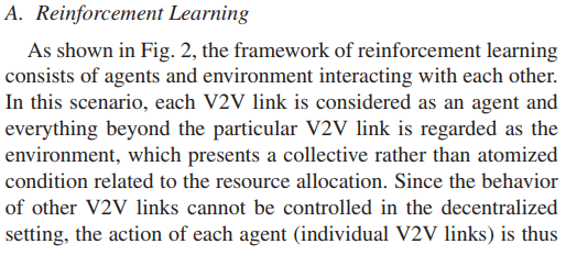 59. 강화학습 agent는 local information 기반으로 독립적으로 선택하기 때문에 다른 V2V link와 동시에 action을 수행할 경우 다른 V2V link의 action에 대해서 알지 못함.