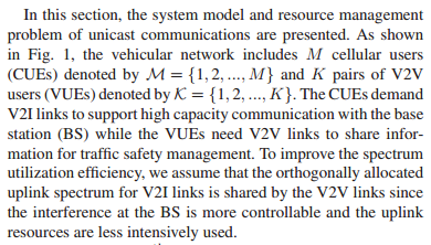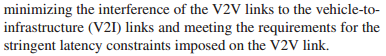 4. CUEs는 V2I link를 VUEs는 V2V link를 사용하는데, V2V link는 traffic safety management를 하기 위해 VUEs 끼리 정보를 공유하는데 사용하고, V2I link는 CUEs가 기지국(BS)과 높은 데이터량을 통신하는데 사용함.