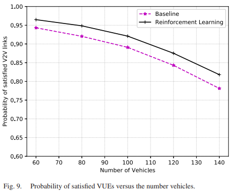 25. Fig9. 은 차량 갯수 대비 V2V link의 latency 제약 조건 만족 확률임.