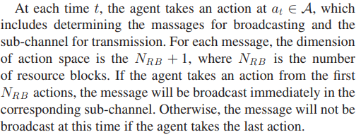 23. 각 t timeslot 별 강화학습 agent는 broadcast를 위한 메시지와 RB를 결정해야함.