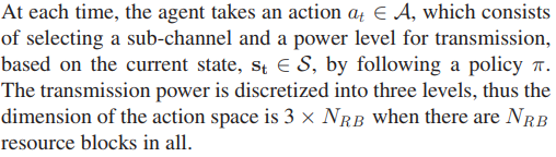 3. 강화학습 agent의 action은 (sub-band, power level) 쌍으로 수행함.