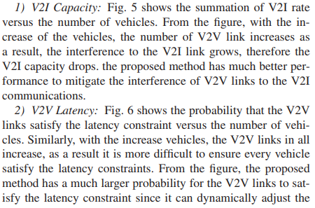 14. fig 5 는 증가하는 차량수 대비 V2I link의 channel capacity 이다. 차량의 증가에 따라 V2V link의 수가 증가하고 결과적으로 V2I link에 대한 간섭이 증가함으로 V2I link의 channel capacity는 감소한다. 제안한 방법이 다른 방법에 비해 좋은 성능을 냈다.