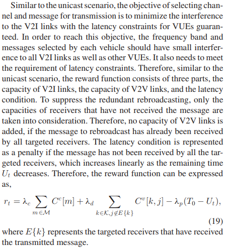 27. reward 는 unicast와 동일함. 하지만 rebroadcasting을 억제하기 위해 메시지를 수신하지 못한 수신자의 데이터 레이트만 계산함. (중복 계산 할 경우 증가하기 때문.)