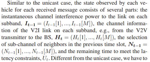 26. unicast 시나리오와 유사하게 강화학습 agent의 목적은 VUE에 대한 latency 제약 조건 충족과 V2I link에 대한 interference를 최소화 하는 것임.