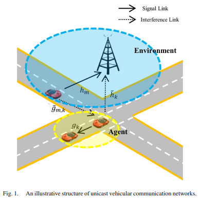 28. 일반적으로 강화학습 Agent는 V2I 링크에 대한 V2V 링크의 간섭을 최소화는 것과 동시에 V2V 링크의 제약 조건(latency)를 충족하기 위해 학습함. (V2I 링크 SINR 증가 + V2V 링크의 제약 조건 만족)