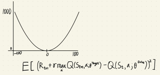 - TD error 값의 절대값이 클 수록 Loss 값이 기하급수적으로 커진다. -> 모든 TD error 범위의 값에 대해서 평등한 Loss 계산이 안된다는 뜻이다. (모든 error에 대한 평등한 Loss 값 x)