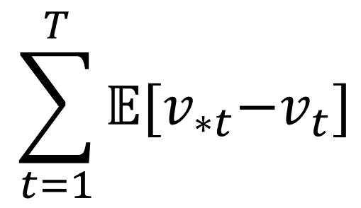 - E[v_*t - v_t]는 t 시점에서 얻었던 Regret 값에 대한 기대값이다. 기대값인 이유는 MAB를 적용할 실제 환경은 확률적이라 가정하기 때문이다.