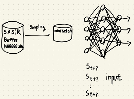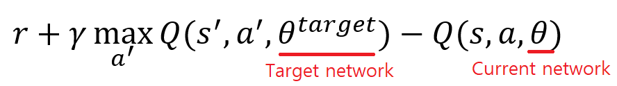 - 학습할때에는 target network는 k번의 학습 스탭마다 current network의 파라미터를 복사하고, k 번의 학습 스탭 동안 current network의 파라미터 값만 업데이트 하는 방법이다.