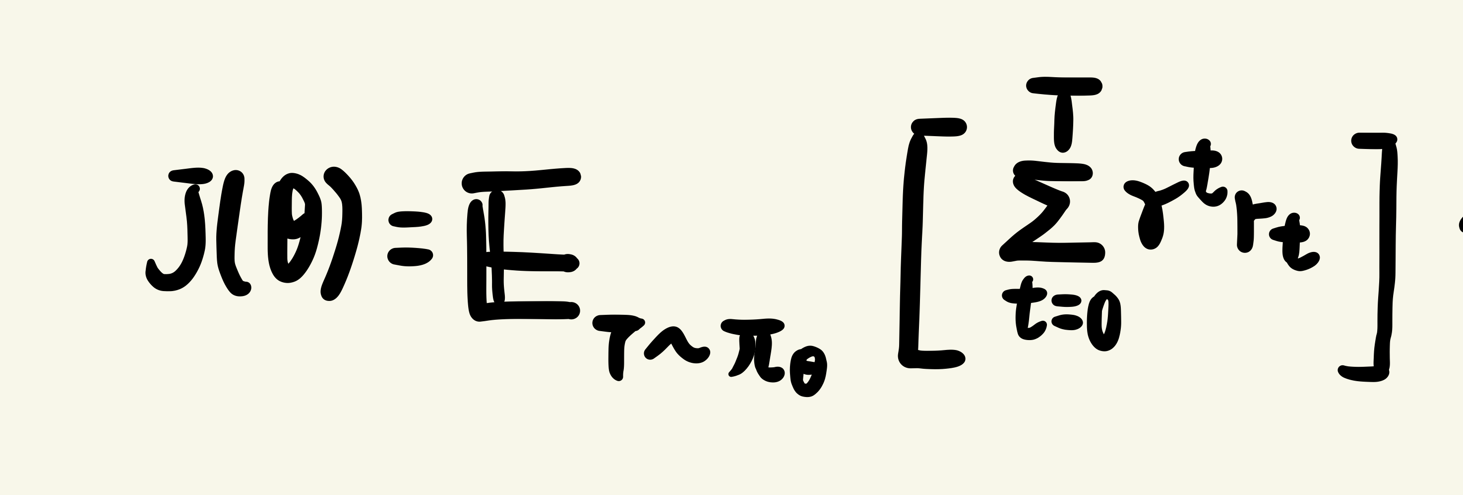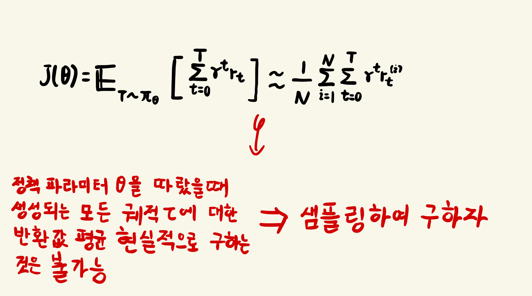 수식을 요약하자면 여러번의 에피소드를 해당 정책에 따라 수행했을 때 발생하는 누적 보상 기대 값이다. 하지만 위 수식은 현실적으로 불가능하다. 이유는 해당 정책에 대한 모든 궤적을 실제로 구할 수 없기 때문이다.