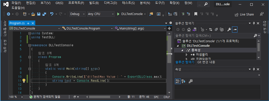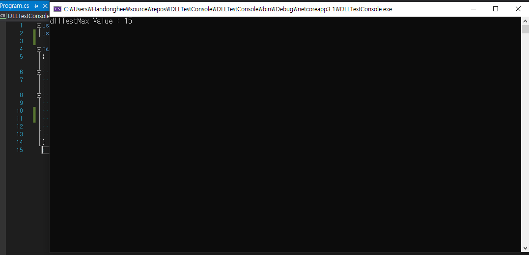 위의 작업 후 DLLTestConsole을 실행하면 어떤 값이 나올까?? 우리 예상은 15이다 참조할 dll의 const 값이 15이기 때문이다.