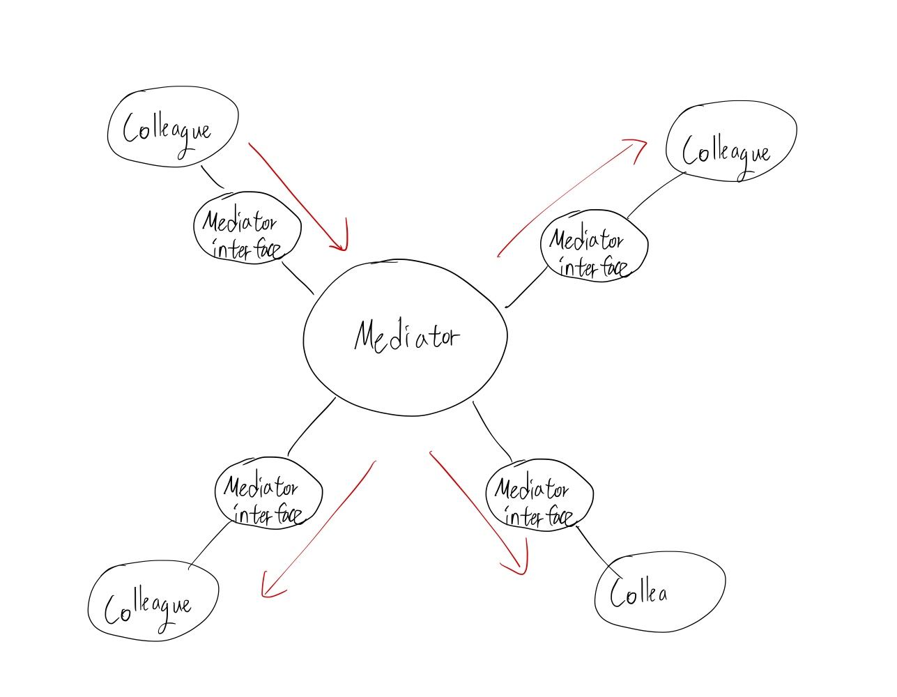 - Colleague(동료): Mediator를 통해 다른 객체와 상호작용하는 객체.