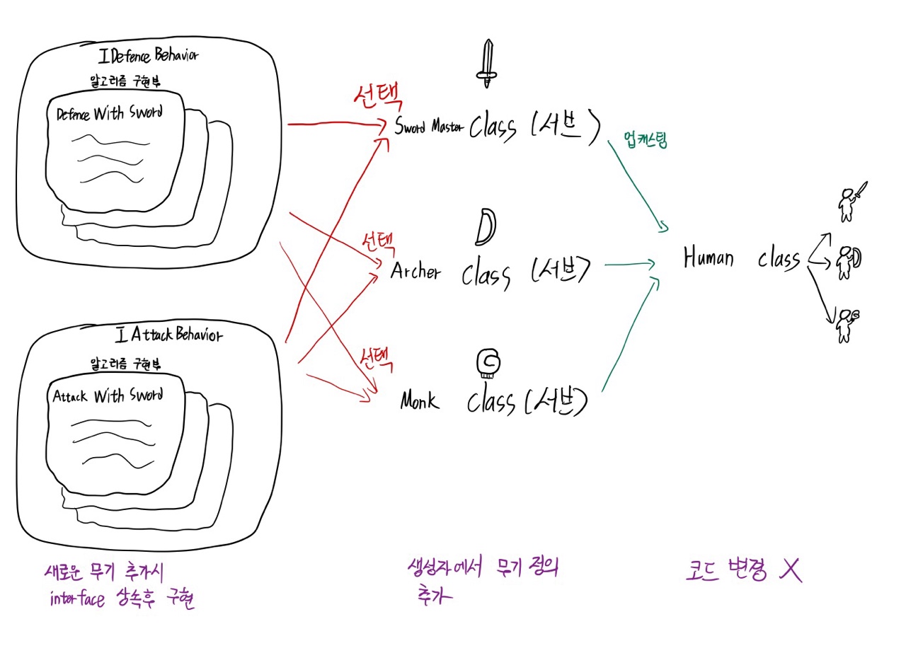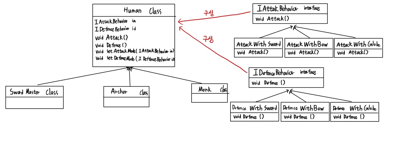 - 생성자 부분에서 행동 interface 규격을 맞추는 Class로 정의하여 베이스 클래스의 행동 interface에 할당하면 된다.